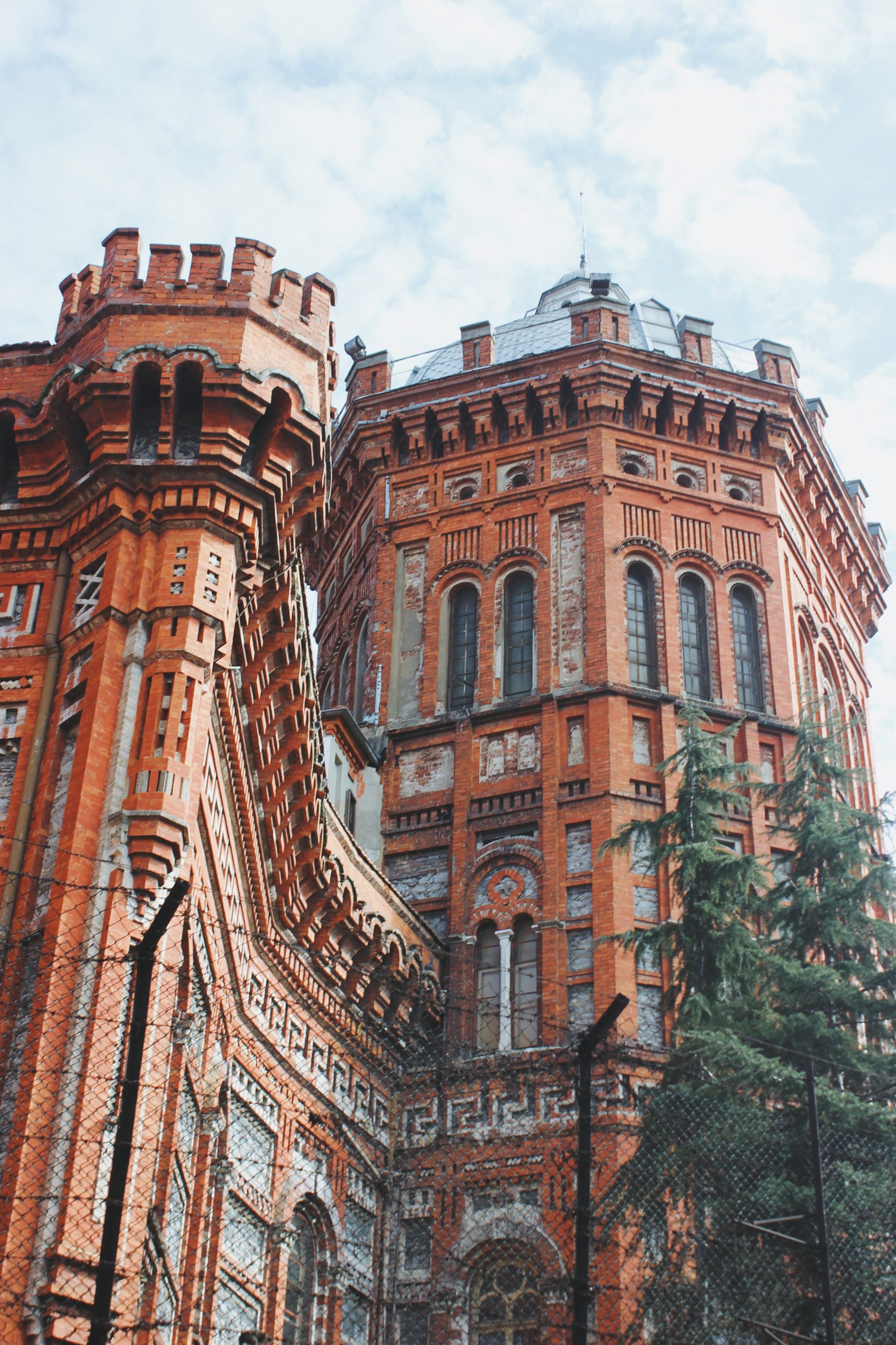 Constructed primarily from deep red bricks, the structure rises dramatically above the surrounding neighborhood.